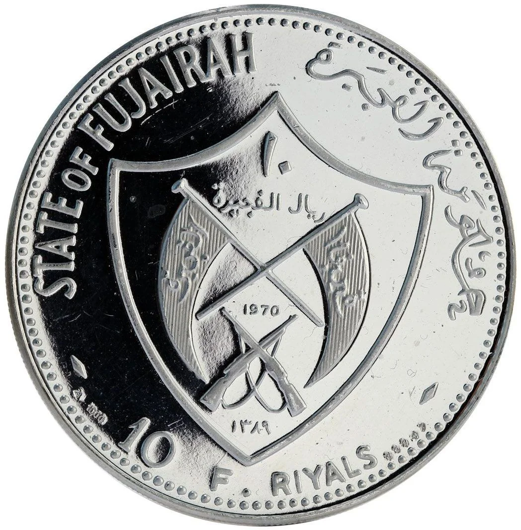Coat of Arms. "Al Fujairah" in Arabic on both flags, mirrored on the right. Mintage figure at lower right, silver fineness at lower left.