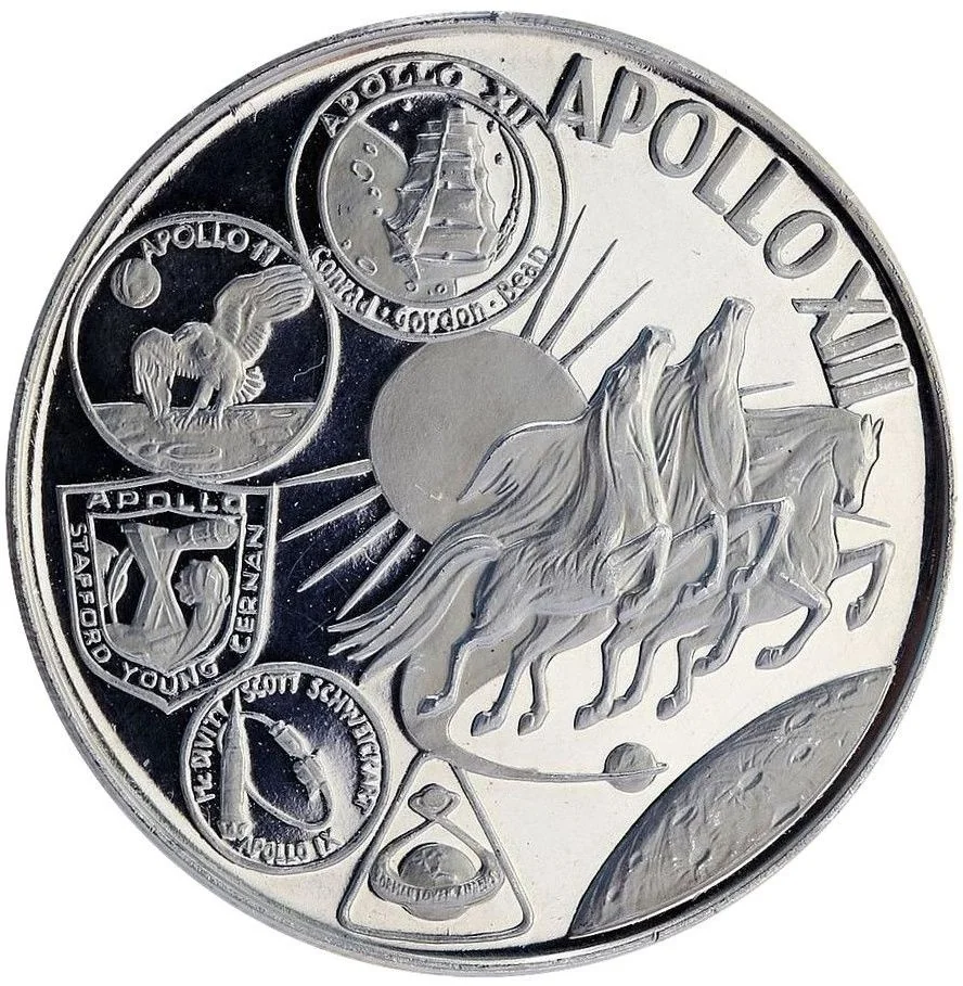 Four Apollo mission badges (9, 10, 11, 12) encircle a sun, with three winged horses leaping from Earth to the Moon.