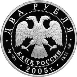 Center: Bank of Russia emblem [two-headed eagle, wings down, with "БАНК РОССИИ" below], circled by dots. Rim inscriptions: top – "ДВА РУБЛЯ", bottom – year "2005". Left: metal/fineness. Right: metal content/mint mark.