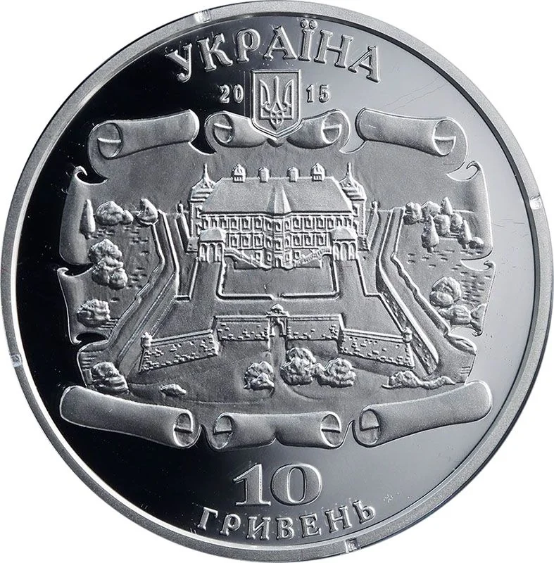 Above: Ukraine's name and coat of arms. Center: A stylized Baroque cartouche with a castle plan. Below: The denomination, 10 hryvnias.