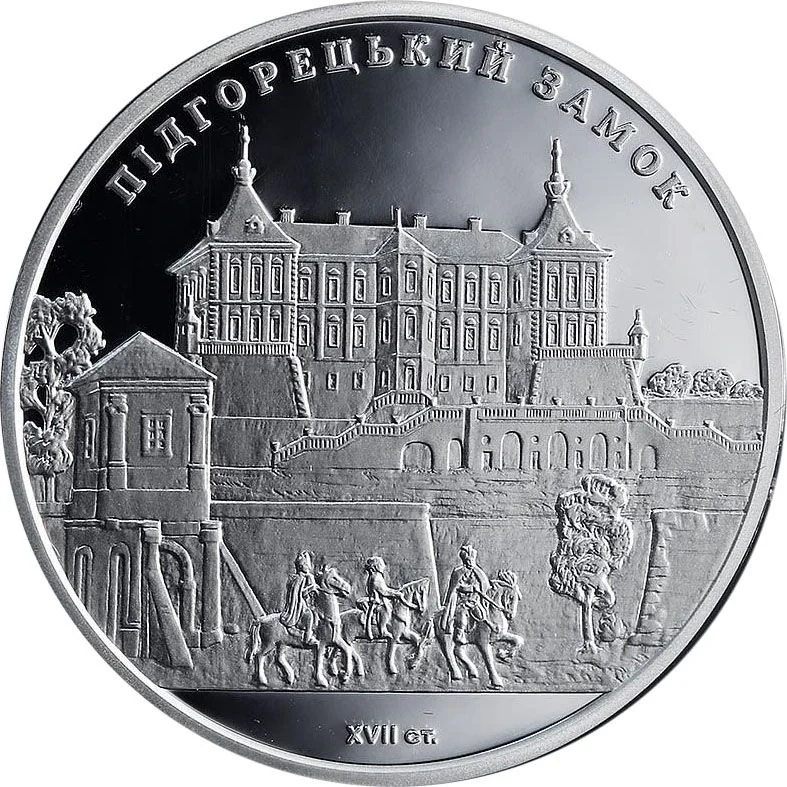 Pidhirtsi Castle with horsemen in the foreground. Above, the legend "ПІДГОРЕЦЬКИЙ ЗАМОК (PIDHIRTSI CASTLE)" curves in a semicircle; below is "XVII ст. (17th century)".