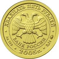 A two-headed eagle with lowered wings and the inscription "БАНК РОССИИ" is in the center, surrounded by dots. The rim reads "ДВАДЦАТЬ ПЯТЬ РУБЛЕЙ" at the top and "2005" at the bottom. Left and right inscriptions indicate the metal, fineness, weight, and mint mark.