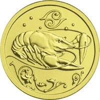 A crawfish against a starry background with stylized plants and the Cancer zodiac symbol.