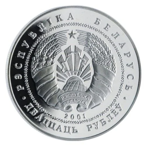 Description: The circular ornament features the relief of the State Coat of Arms. Below are the year and alloy standard. The rim inscriptions: "РЭСПУБЛIКА БЕЛАРУСЬ" (REPUBLIC OF BELARUS) above and "ДВАЦЦАЦЬ РУБЛЁЎ" (TWENTY ROUBLES) below.