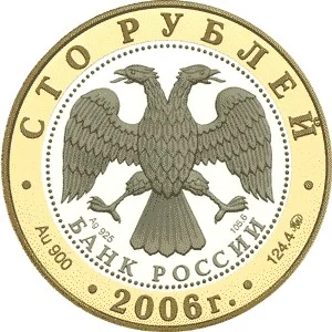 Obverse: Bank of Russia emblem within a dotted circle. Reverse: "ONE HUNDRED ROUBLES" above, "2006" below. Left and right inscriptions indicate metal, fineness, weight, and mint mark.