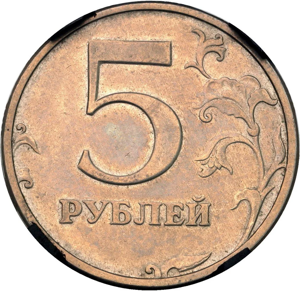 Left of center: the denomination "5 РУБЛЕЙ". Below, along the rim, a stylized vegetal ornament of an intertwining branch.