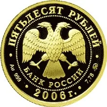 The center features the Bank of Russia emblem (a two-headed eagle with wings down, above the inscription "БАНК РОССИИ"), surrounded by a dotted circle. The rim inscriptions: "ПЯТЬДЕСЯТ РУБЛЕЙ" (FIFTY ROUBLES) above, the year "2006" below, with the metal specification on the left and its fine content and mint mark on the right.