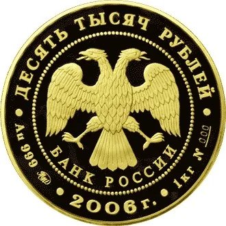 Center: Bank of Russia emblem (two-headed eagle, wings down, with "БАНК РОССИИ" below) within a dotted circle. Above: "ДЕСЯТЬ ТЫСЯЧ РУБЛЕЙ". Below left: metal, fineness, mint mark; center: "2006 г."; right: metal weight and serial number №___.