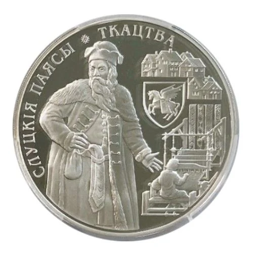 Description: Left rim inscription: "СЛУЦКІЯ ПАЯСЫ. ТКАЦТВА" (THE BELTS OF SLUTSK. WEAVING). Left side: a merchant figure symbolizing trade. Right side: the Slutsk coat of arms, a weaver at a loom, and images of the town, symbolizing its manufacturing center.