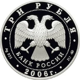 Center: Bank of Russia emblem (two-headed eagle, wings down, with "БАНК РОССИИ" below), circled by dots. Rim inscriptions: top – "ТРИ РУБЛЯ", bottom – "2006". Left: metal/fineness. Right: fine metal content/mint mark.