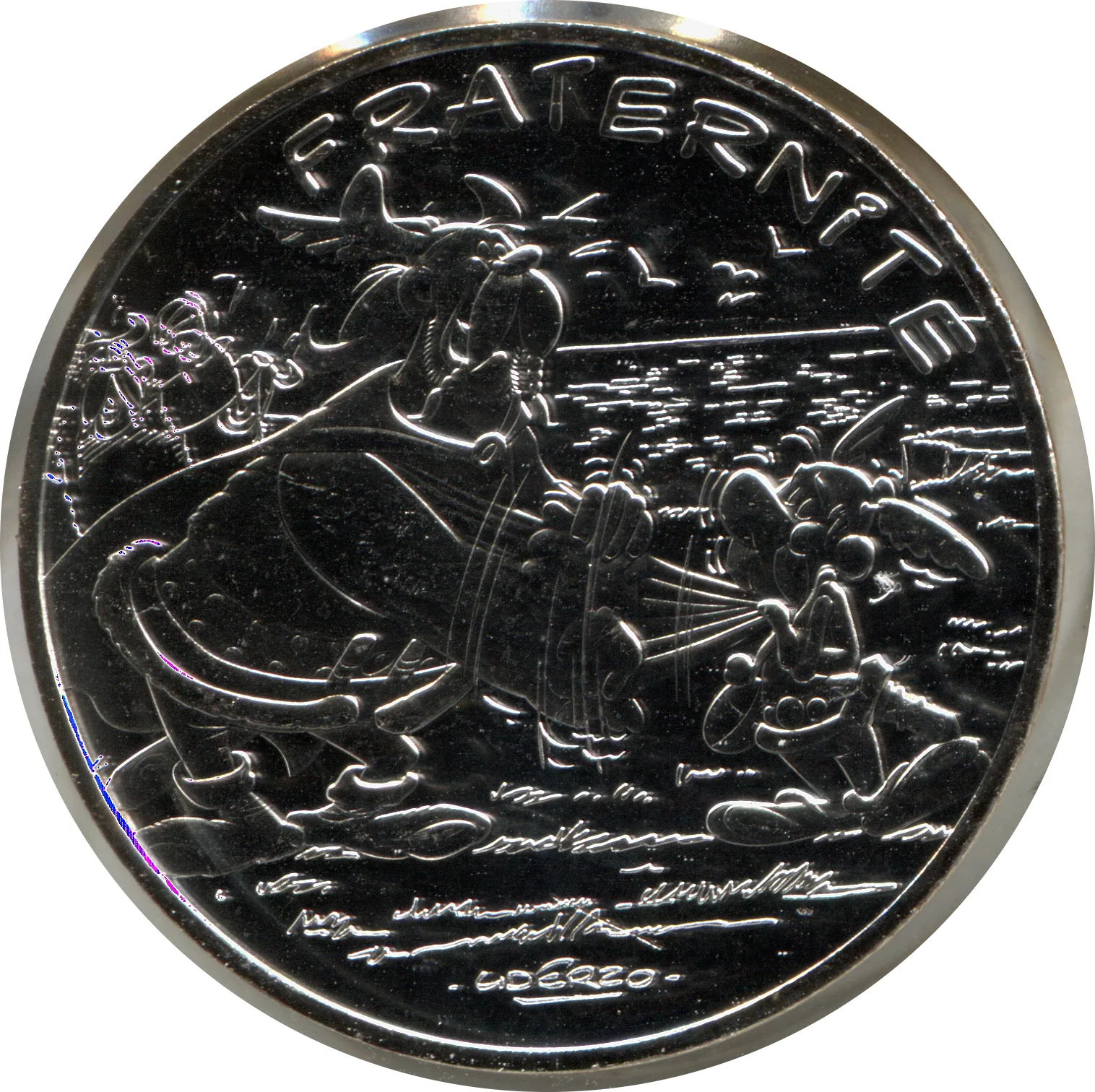 "10 EURO" between laurel and oak branches, encircled by "RÉPUBLIQUE FRANÇAISE", three hexagons, and the year. To the right of the 10, a cornucopia below and a pentagon above.