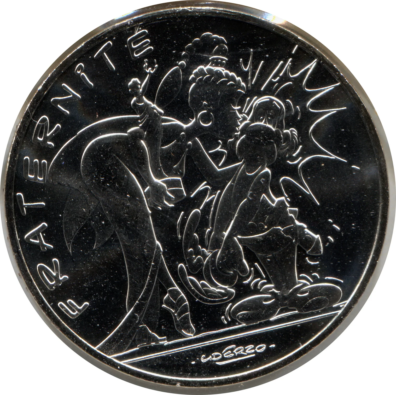 "10 EURO" between laurel and oak branches, encircled by "RÉPUBLIQUE FRANÇAISE", three hexagons, and the year. To the right of the 10, a cornucopia below and a pentagon above.