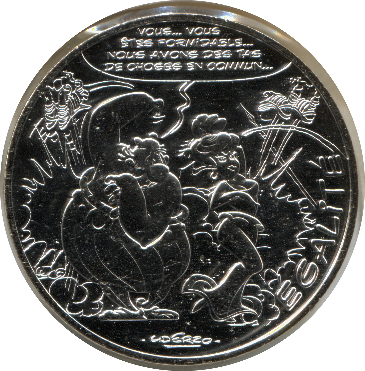 Obélix and Madame Agecanonix unite against the Romans, demonstrating gender equality in village defense. This illustration is from "Le Devin."