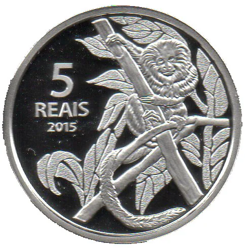 The reverse features the golden lion tamarin amid greenery, alongside the face value and issue year (2015).