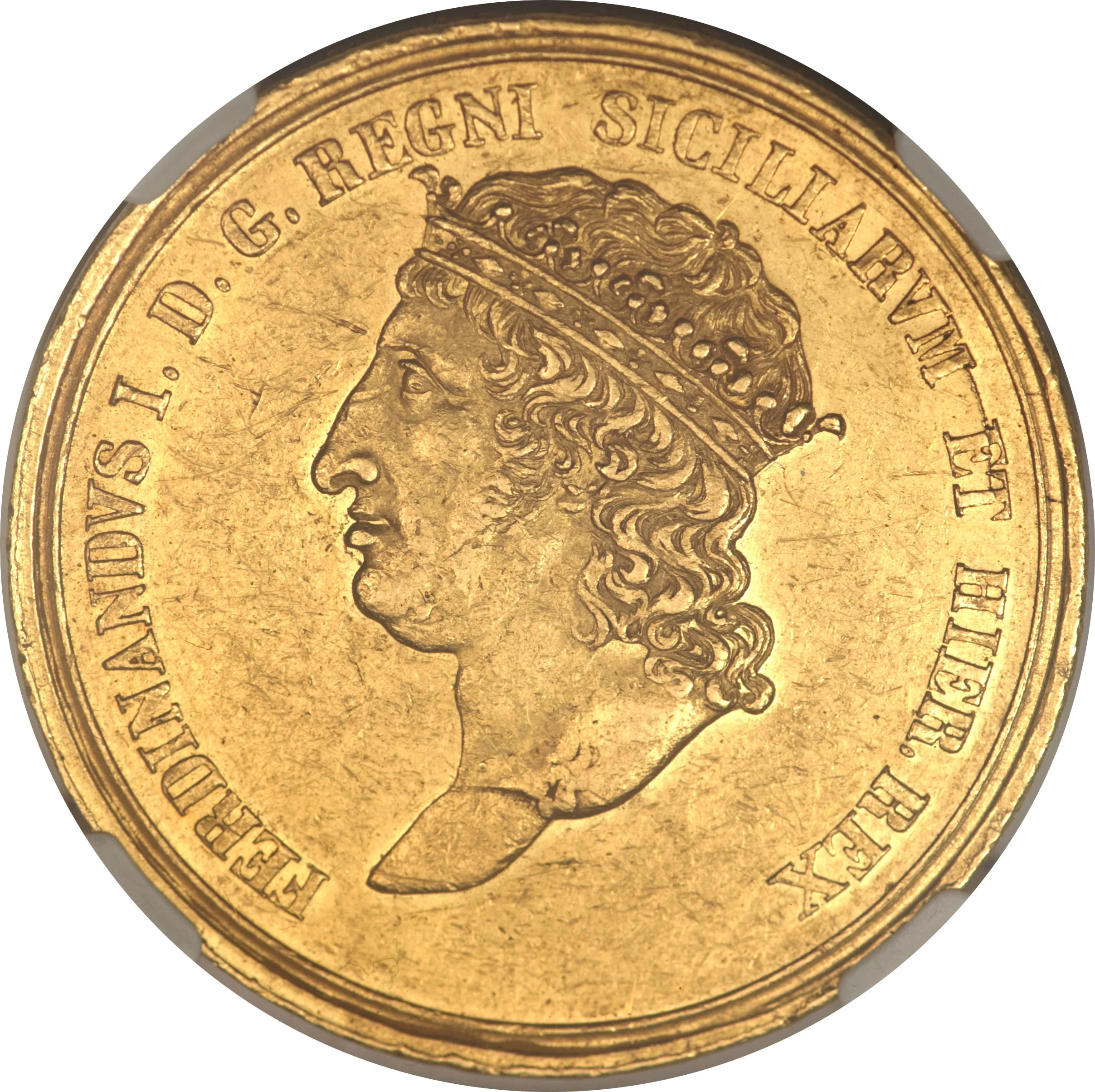 Description: Bourbon Genius standing, crowned column and shield flank. Date in legend, three-line exergue inscription.