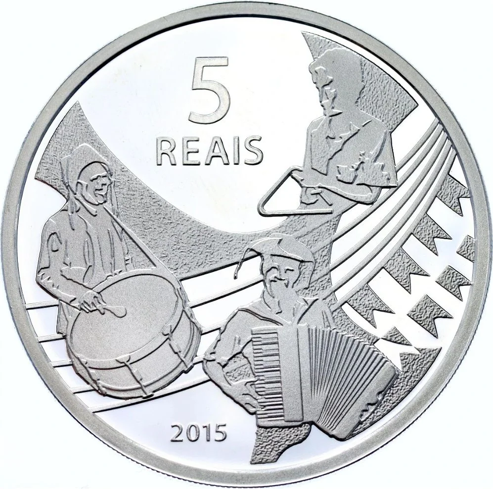 The reverse depicts musicians playing forró instruments, with the face value and year (2015) completing the design.