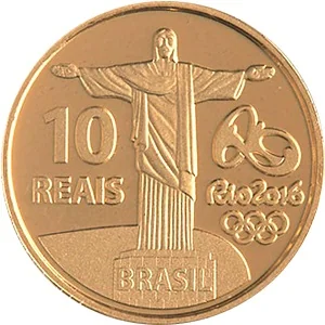 Christ the Redeemer is shown with the 10 reais note and Rio 2016 logo, with "Brazil" at its base.