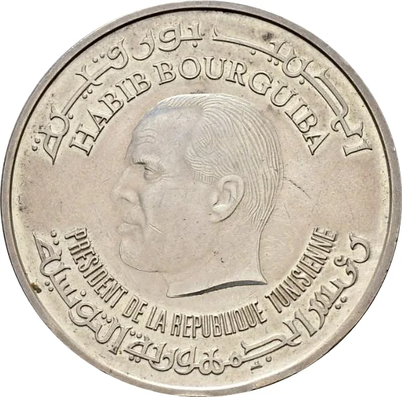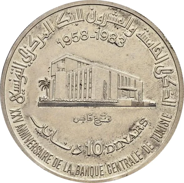 Description: Gabès Central Bank building, value, and dates. Arabic and French inscriptions.
