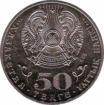 Description: The obverse features the Republic of Kazakhstan emblem, with the abbreviation "ҚҰБ" to its right. The denomination "50 ТЕҢГЕ" is at the bottom, flanked by national ornament. The perimeter is inscribed with "ҚАЗАҚСТАН ҰЛТТЫҚ БАНКІ".