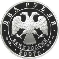 Center: Bank of Russia emblem (two-headed eagle, wings down, with "BANK OF RUSSIA" below), within a dotted circle. Rim inscriptions: top – "TWO ROUBLES"; bottom left – metal and fineness; center – "2007"; bottom right – metal content and mint mark.