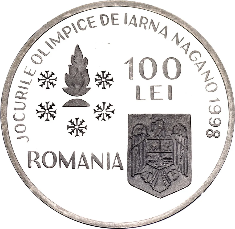 100 LEI, 1996. Features the Olympic flame, five snowflakes, Romania's coat of arms, and the inscription "NAGANO WINTER OLYMPIC GAMES 1998."