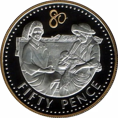 Queen Elizabeth II and the Queen Mother cradling a baby. "Gilded 80" above, value in letters below.