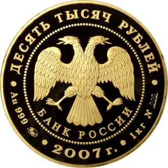 Center: The Bank of Russia emblem (two-headed eagle with wings down, over the inscription "БАНК РОССИИ") within a dotted circle. Above: "ДЕСЯТЬ ТЫСЯЧ РУБЛЕЙ". Below left: Metal, fineness, and mint mark; center: "2007 г."; right: Fine metal content and serial number №___.