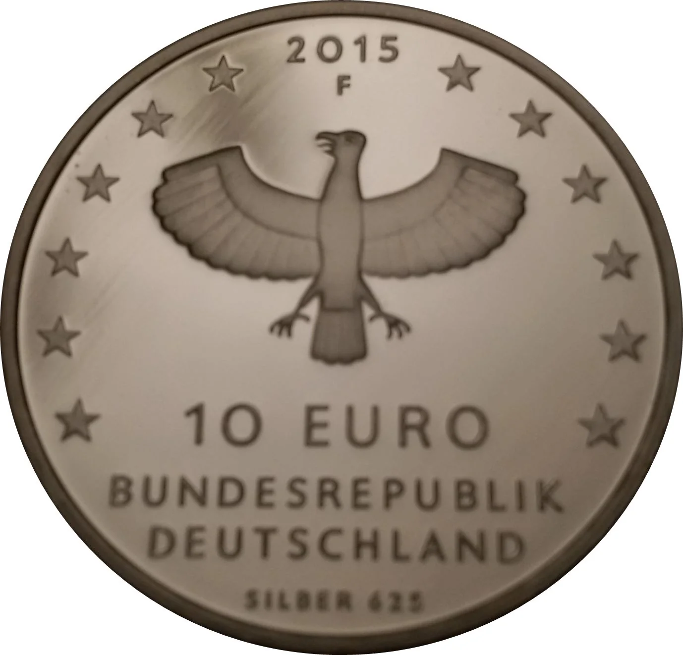 Stylized German eagle above the year and Stuttgart's "F" mint mark, flanked by twelve EU stars. Below is "10 EURO," "BUNDESREPUBLIK DEUTSCHLAND," and "SILBER 625."