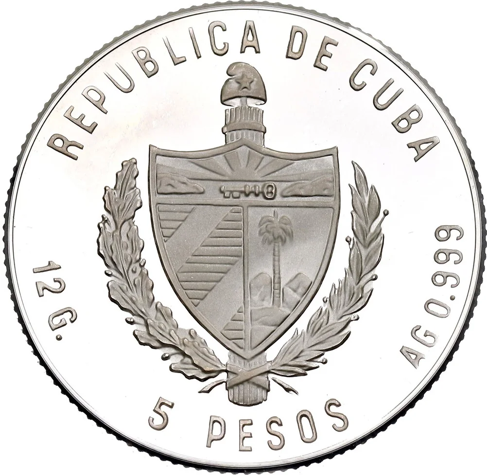Cuban coat of arms with country name above, weight and finess on the sides, and face value below.