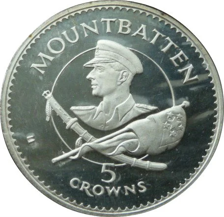 Lord Mountbatten in left-facing profile, wearing a military cap, over crossed sword and furled flag.