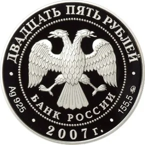 Central emblem: Bank of Russia's two-headed eagle, with "BANK OF RUSSIA" below, inside a dotted circle. The rim reads "TWENTY FIVE ROUBLES" above, and below shows metal/fineness, "2007", metal content, and mint mark.