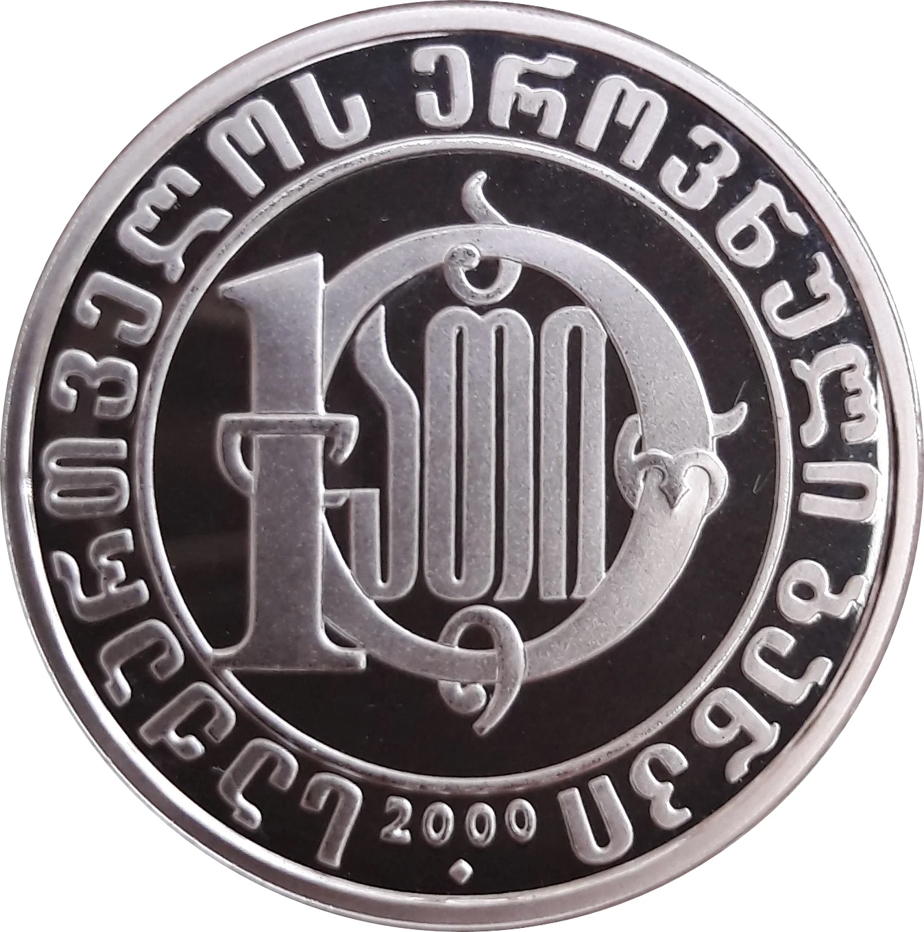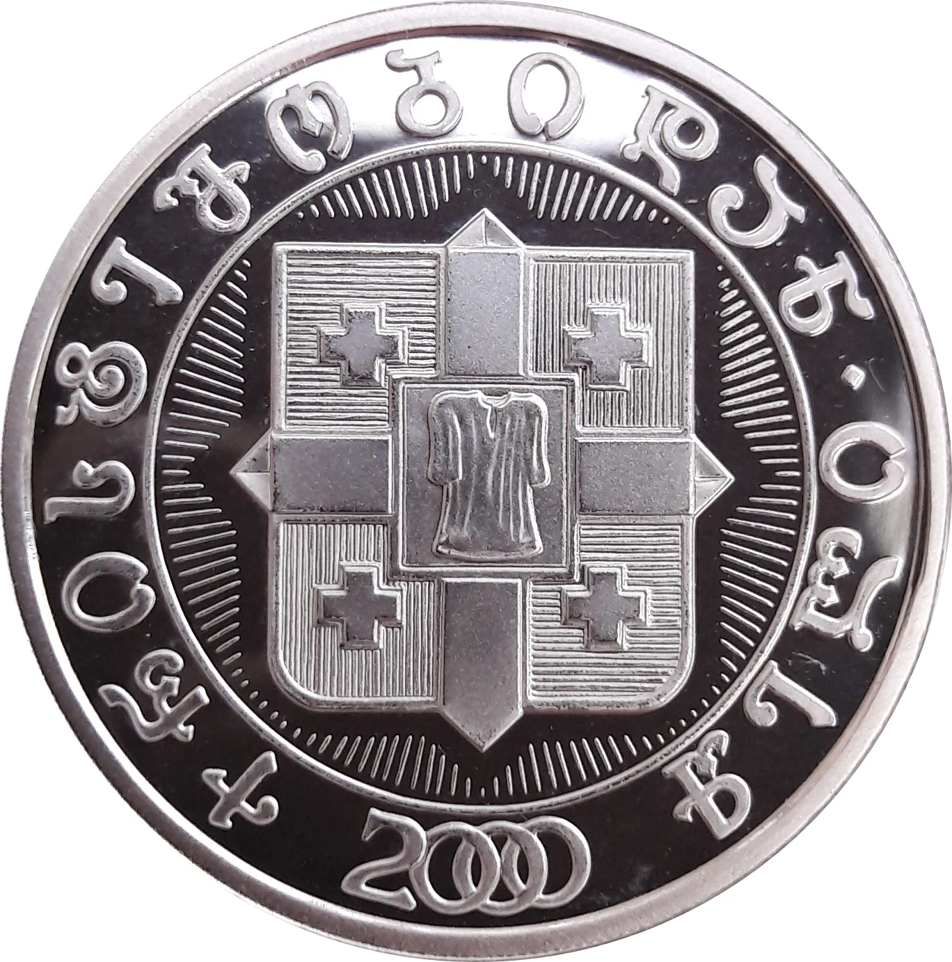 Heraldic shield with crosses and the Sacred Gown of Christ, encircled by a Georgian legend: "2000 A.D."