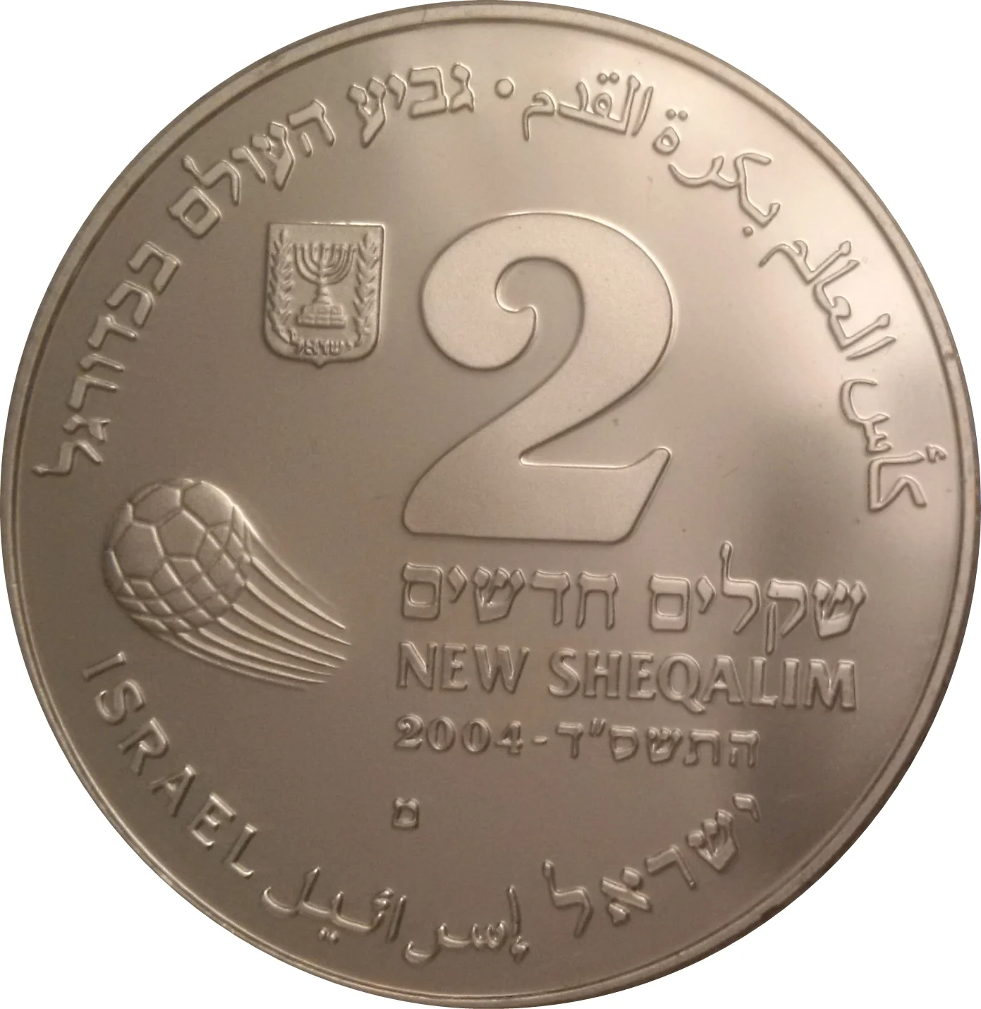 Israeli emblem and face value in Hebrew and English. "Israel" in three languages and mint year. A soaring soccer ball with "Soccer World Cup" in Hebrew and Arabic above.