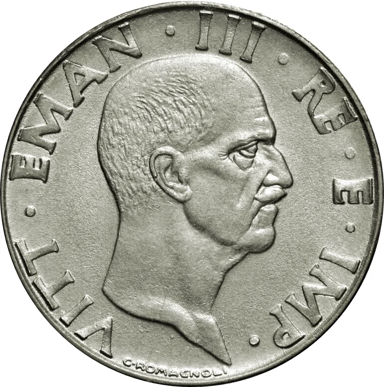 Victor Emmanuel III facing right, with engraver's name below. Title denotes King of Italy and Emperor of Ethiopia.