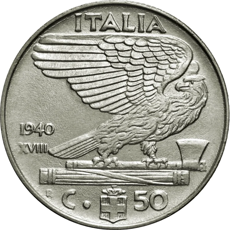 Eagle in profile, wings raised, clutching a fasces with an axe. Fascist Era date near its tail; value and mintmark flank the Savoy shield below.