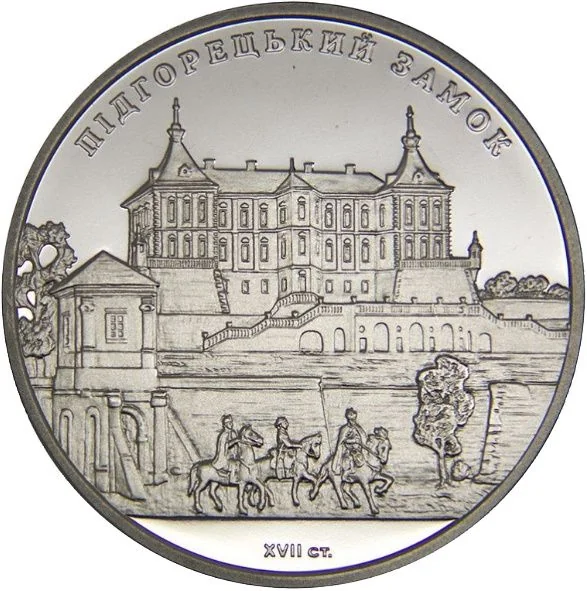 The design features Ukraine's coat of arms above a Baroque-style castle plan cartouche. The face value "5 hryvnias" is below, with the National Bank Mint mark at the lower left.