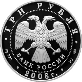 Central: Bank of Russia emblem (two-headed eagle, wings down, with "БАНК РОССИИ" below), encircled by dots. Rim inscription: top - "ТРИ РУБЛЯ"; bottom left - metal and fineness, centre - "2008 г.", right - metal content and mint mark.