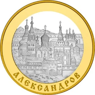 Foreground: fortress walls and the Holy Gate with the Theodor Stratilat Church. Behind: Trinity Cathedral. Right: Raspyatskaya Bell Tower. Background: Intercession and Assumption Churches. Rim inscription: "АЛЕКСАНДРОВ".