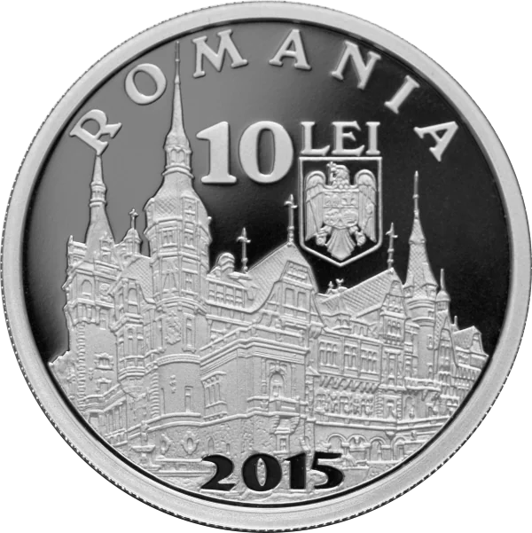 Peleș Castle, "ROMANIA," 10 LEI, Romania's coat of arms, and "2015."