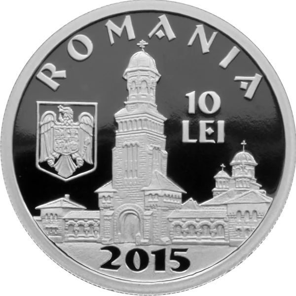 Coronation Cathedral in Alba Iulia, arched "ROMANIA" inscription, "10 LEI" face value, Romanian coat of arms, and issue year "2015".