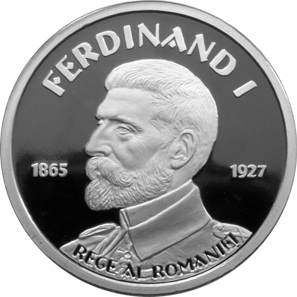 Portrait of King Ferdinand I (1865–1927) with the inscriptions "FERDINAND I" and "REGE AL ROMANIEI" arched above.