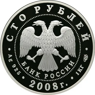 Center: Bank of Russia emblem (two-headed eagle, wings down, with "БАНК РОССИИ" below), circled by dots. Rim inscriptions: top - "СТО РУБЛЕЙ"; bottom left - metal and fineness; center - "2008 г."; bottom right - metal content and mint mark.