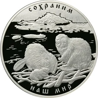 A beaver family on water: two adults, a baby, and one swimming. Their stick lodge is on the bank. Rim text: "СОХРАНИМ НАШ МИР" (PROTECT OUR WORLD).