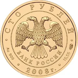 Center: Bank of Russia emblem (two-headed eagle, wings down, with "БАНК РОССИИ" below), circled by dots. Rim inscriptions: top - "СТО РУБЛЕЙ"; bottom left - metal and fineness; center - "2008 г."; bottom right - metal content and mint mark.