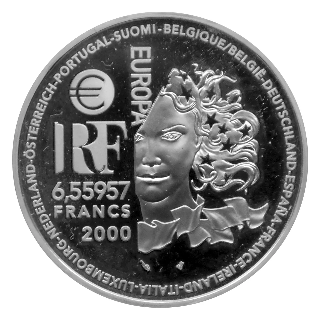 Bust of Europa with a circular legend of euro-adopting countries in their official languages.