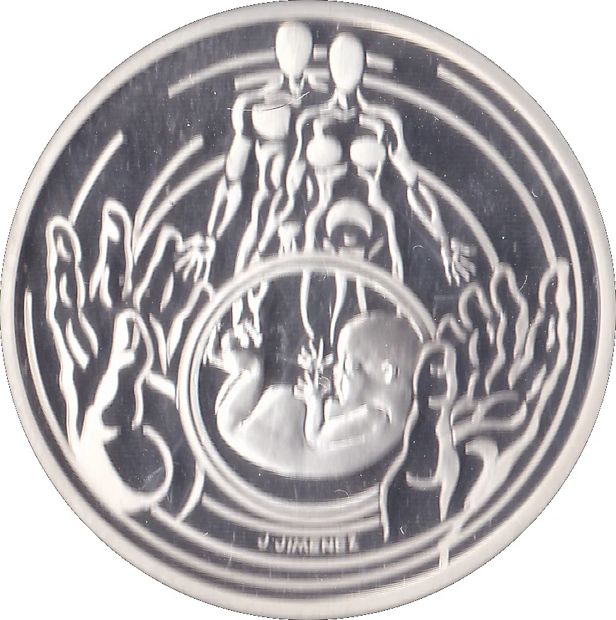 A stylized couple above a fetus in a sphere, cradled by hands.