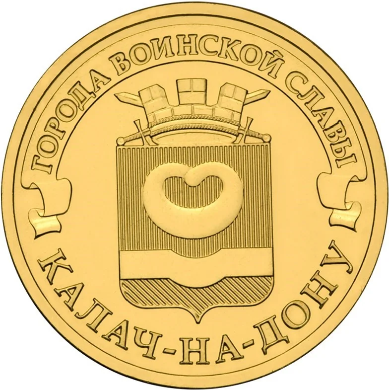 The town's coat of arms is surmounted by a ribbon with the semicircular inscription "ГОРОДА ВОИНСКОЙ СЛАВЫ" and encircled below by the name "КАЛАЧ-НА-ДОНУ".