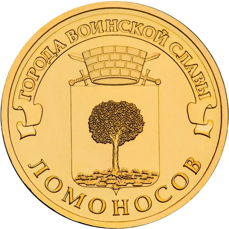 Lomonosov's coat of arms, above it on a ribbon: "ГОРОДА ВОИНСКОЙ СЛАВЫ", below along the rim: "ЛОМОНОСОВ".