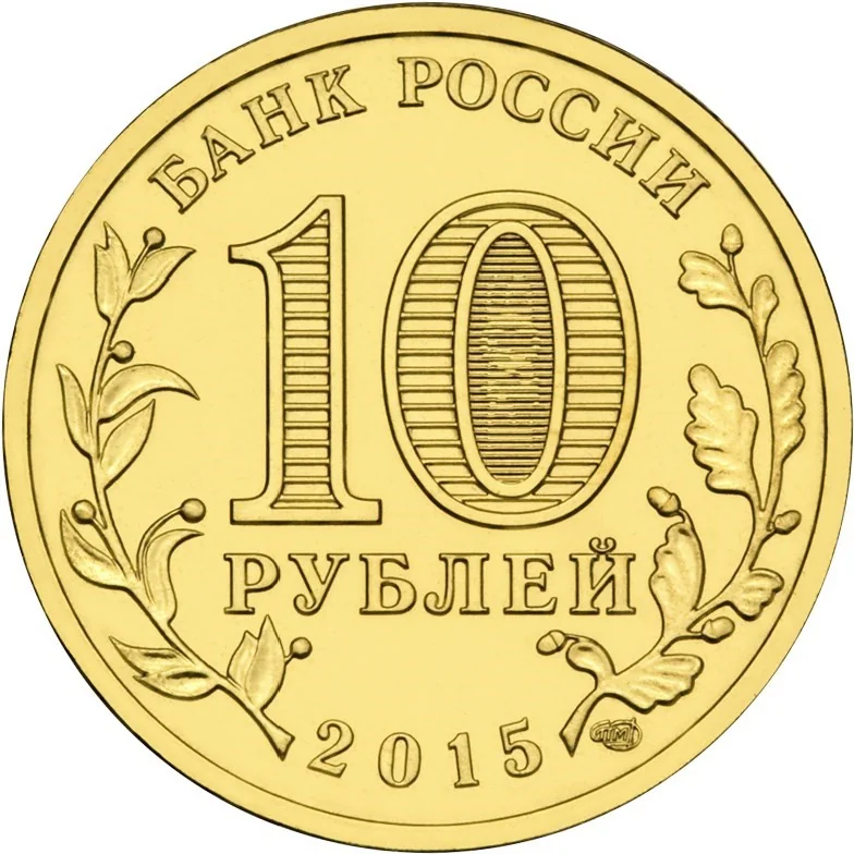 The center features the denomination "10 РУБЛЕЙ". Within the "0", the number "10" and "РУБ" appear alternately at different angles. Around the rim are the Bank of Russia inscription, the year 2015, stylized laurel and oak branches, and the mint mark below.