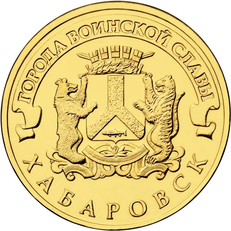 A shield with the Khabarovsk coat of arms, topped by a ribbon reading "ГОРОДА ВОИНСКОЙ СЛАВЫ" and encircled below by "ХАБАРОВСК".